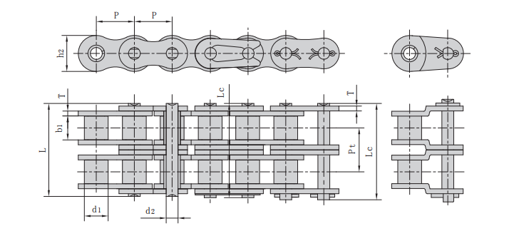 鏈號(hào) 節(jié)距 滾子直徑 內(nèi)節(jié)內(nèi)寬 銷(xiāo)軸直徑 銷(xiāo)軸長(zhǎng)度 內(nèi)鏈板高度 鏈板厚度 排距 抗拉強(qiáng)度 平均抗拉強(qiáng)度 每米長(zhǎng)重