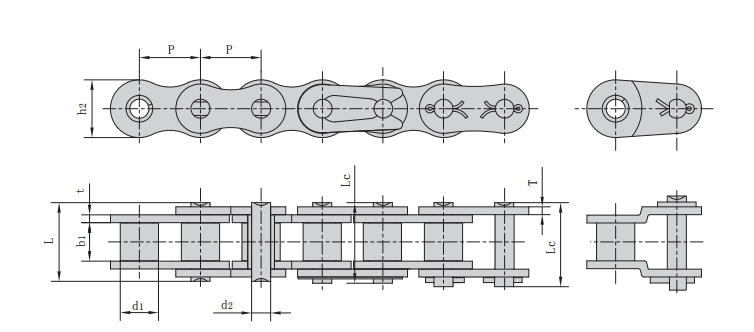 鏈號 節距 滾子直徑 內節內寬 銷軸直徑 銷軸長度 內鏈板高度 鏈板厚度 抗拉強度 平均抗拉強度 每米長重