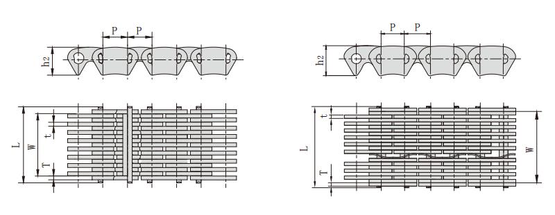 鏈條型號(hào) 節(jié)距 鏈寬 銷軸長(zhǎng)度 鏈板高度 鏈板厚度 導(dǎo)向形式 片數(shù) 抗拉強(qiáng)度 每米長(zhǎng)重