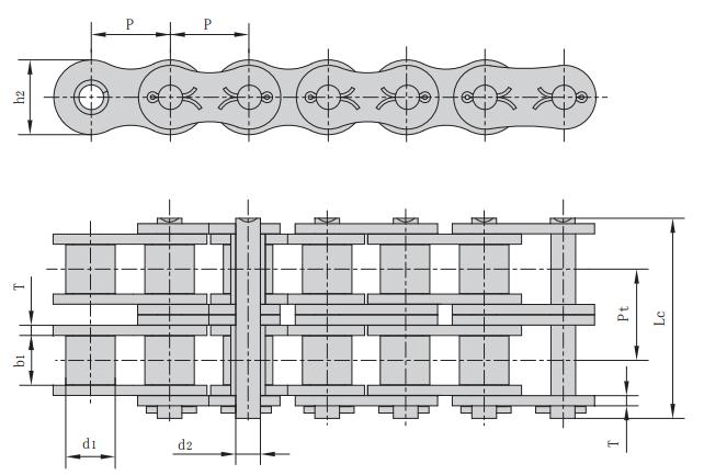 鏈號 鏈號 節距 滾子直徑 內節內寬 銷軸直徑 銷軸長度 內鏈板高度 鏈板厚度 排距 抗拉強度 平均抗拉強度 每米長重