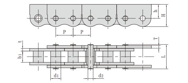 鏈條型號(hào) 節(jié)距 滾子直徑 內(nèi)節(jié)內(nèi)寬 銷軸直徑 銷軸長度 鏈板尺寸 抗拉強(qiáng)度 每米長重