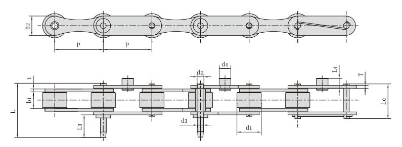 鏈號 節距 滾子直徑 內節內寬 銷軸直徑 銷軸長度 鏈板尺寸 附件尺寸 抗拉強度