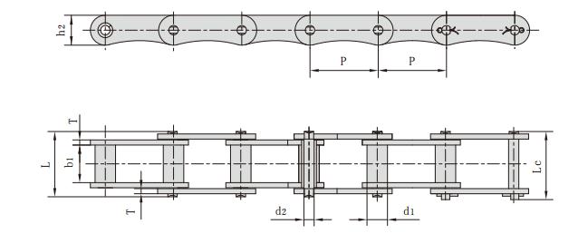 鏈號 節(jié)距 滾子直徑 內(nèi)節(jié)內(nèi)寬 銷軸直徑 銷軸長度 鏈板高度 鏈板厚度 抗拉強度 每米長重