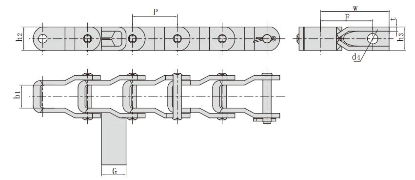 鏈號 節(jié)距 內節(jié)內寬 鏈板高度 附板尺寸 抗拉強度