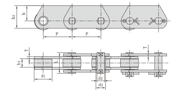 鏈號 節距 滾子直徑 銷軸直徑 套筒直徑 鏈板厚度 內節內寬 銷軸長度 鏈板高度 抗拉強度
