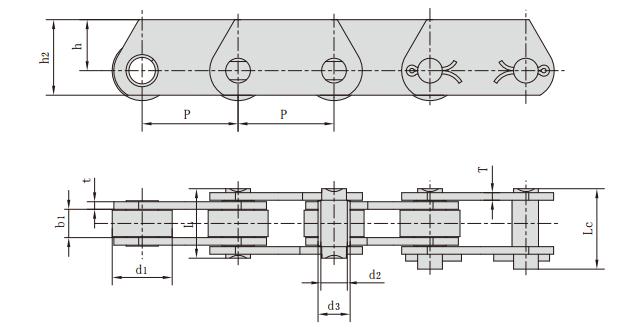 鏈號 節(jié)距 滾子直徑 銷軸直徑 套筒直徑 內(nèi)節(jié)內(nèi)寬 銷軸長度 鏈板高度 鏈板厚度 抗拉強度