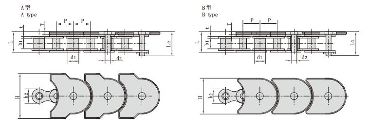 鏈條型號 節距 滾子直徑 內節內寬 銷軸直徑 銷軸長度 鏈板尺寸 附板尺寸 抗拉強度 每米長重 型式