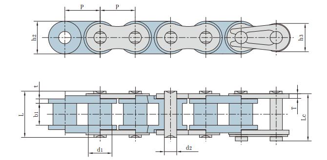 鏈號 節距 滾子直徑 內節內寬 銷軸直徑 銷軸長度 鏈板高度 鏈板厚度 抗拉強度
