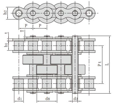 鏈號(hào) 節(jié)距 滾子直徑 內(nèi)節(jié)內(nèi)寬 銷軸直徑 銷軸長(zhǎng)度 鏈板尺寸 排距 抗拉強(qiáng)度 平均抗拉強(qiáng)度